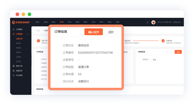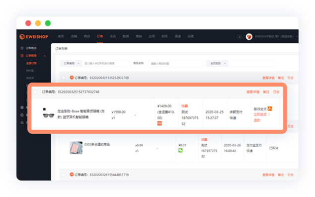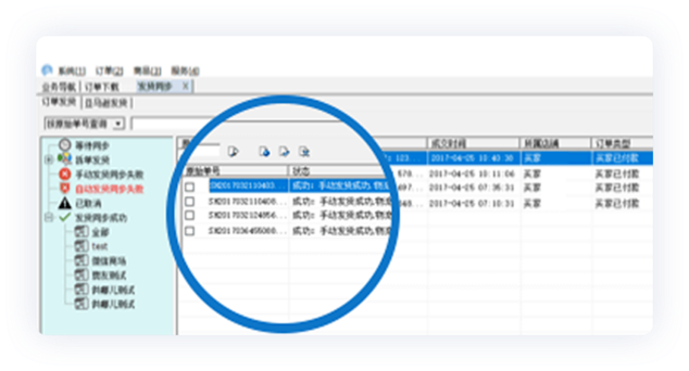 网店管家软件可同步EWEISHOP发货订单的原始单号、成交时间、订单类型、发货时间、收件人、发货单号及发货方式